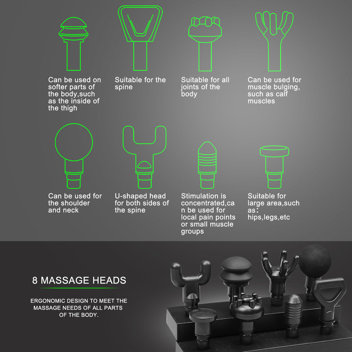 From neck to arms and spine to foot soles, there’s no muscle group that our Massage Gun cannot treat! With multiple massage heads, you won’t even need another massager to take care of your aching muscles. Our massage gun comes with 8 heads – each perfect for a specific muscle group. Spiral head is most useful for joints. Globule head is ideal for large muscle groups. Forked head works its magic on neck and spine. Wedge head reduces stiffness from palms and soles. Lastly, Flat & Bullet heads are applicable to all body parts! And the other 2 heads are also used for other parts.This tool is a complete package for any kind of muscle pain!